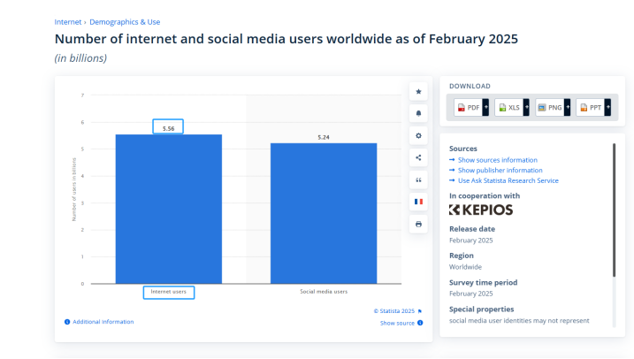 數(shù)據(jù)支持:根據(jù)Statista的報告,截至2025年2月,全球有55.6億人使用互聯(lián)網(wǎng),占全球人口的67.9%。其中,52.4億人,占全球人口的63.9%,使用社交媒體。